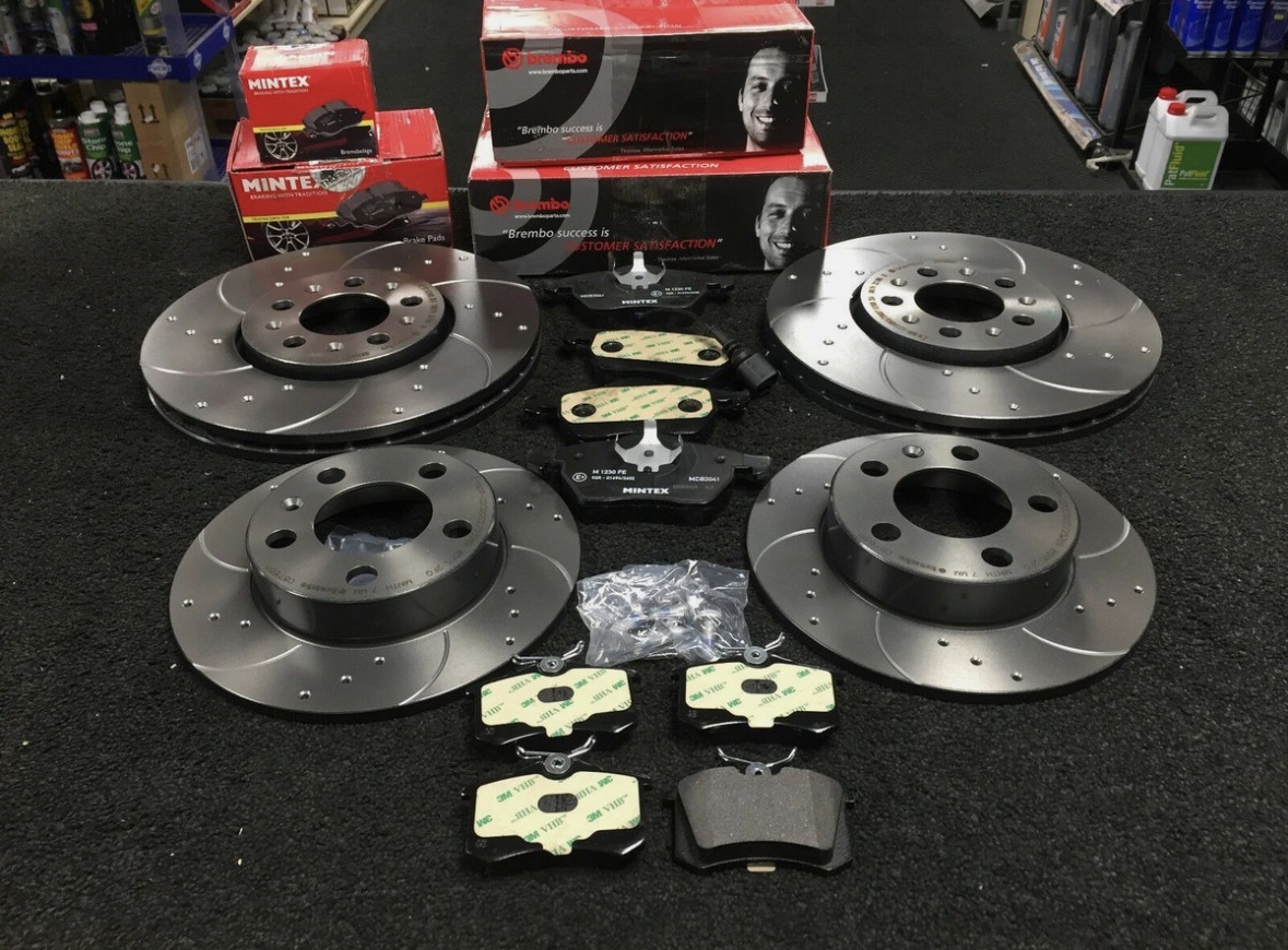 PERFORMANCE FRONT REAR BREMBO DRILLED GROOVED BRAKE DISCS AND MINTEX BRAKE PADS